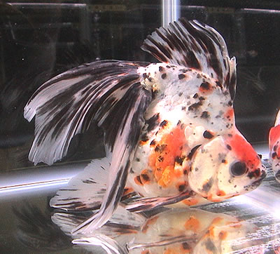 「琉金(リュウキン)」の体型に、「三色出目金(サンショクデメキン)」の体色(三色)をしています。